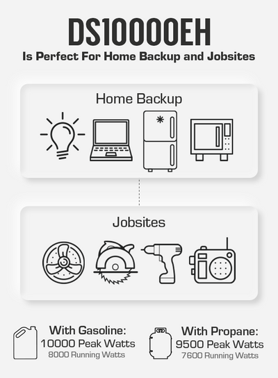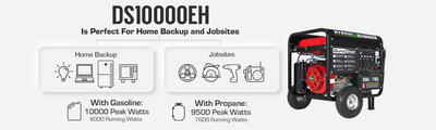 With 10,000 watts of power, the DS10000EH Dual Fuel generator will keep your whole home running during a storm or power outage.