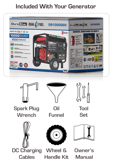What's in the Box? DS10000EH Generator, Oil Funnel, Spark Plug Wrench, Tool Set, Wheel & Handle Kit, DC Charging Cables, and Owner's Manual