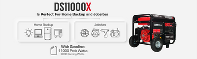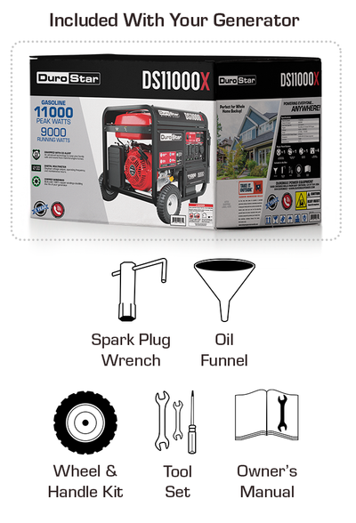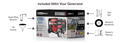 | What's in the Box? | DS11000X Generator, Oil Funnel, Spark Plug Wrench, Tool Set, Wheel & Handle Kit, and Owner's Manual |