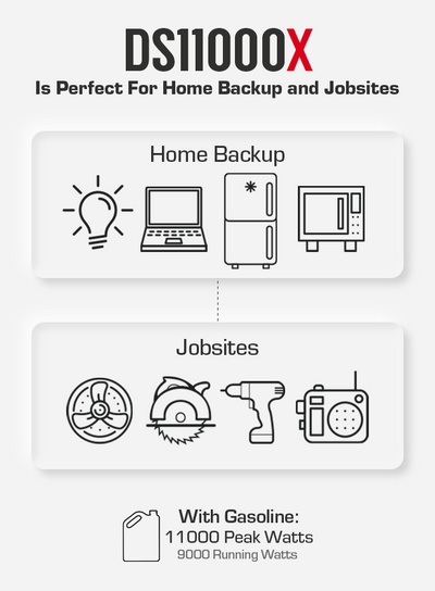 With 11,000 watts of power, the DS11000X generator will keep your whole home running during a storm or power outage, while protecting your family from harmful fumes with CO Alert.