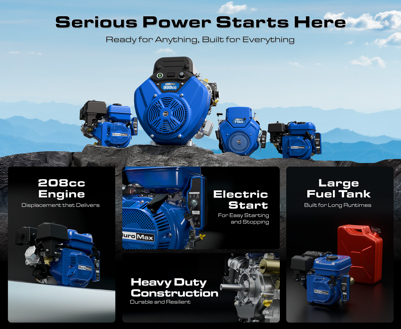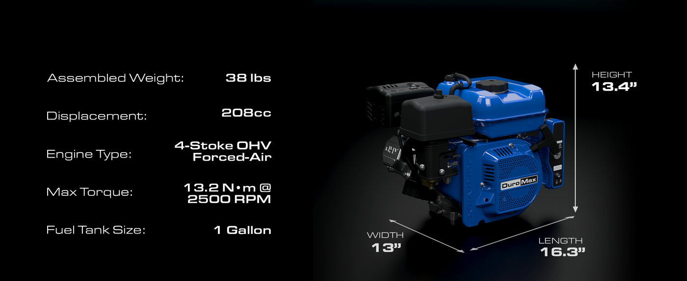 | What's in the Box? | DuroMax XP7HPE Engine, 12V Battery Leads, and Owner's Manual |