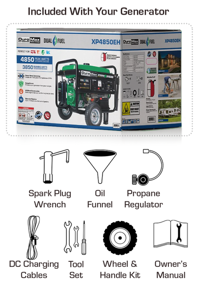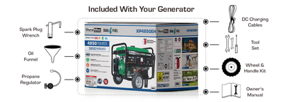 | What's in the Box? | XP4850EH Generator, Oil Funnel, Spark Plug Wrench, Tool Set, Wheel & Handle Kit, DC Charging Cables, Propane Regulator, and Owners Manual |