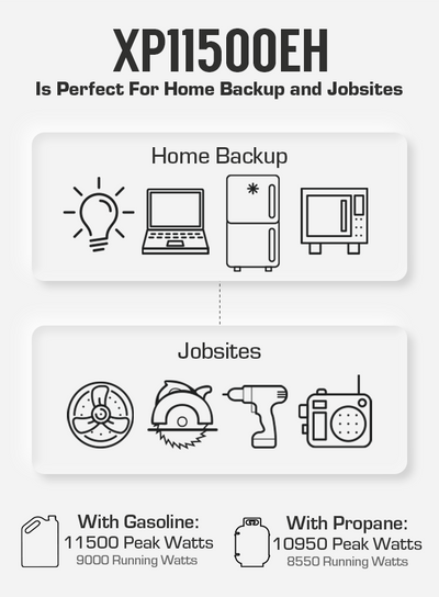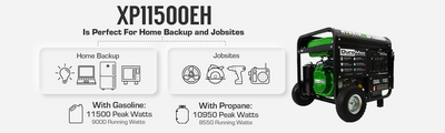 With 11,500 watts of power, the XP11500EH Dual Fuel generator will keep your whole home running during a storm or power outage.