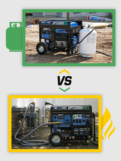 Tri Fuel technology allows you to run your portable generator on either Natural Gas, Propane, or Gasoline offering the ULTIMATE freedom and flexibility of fuel choice.