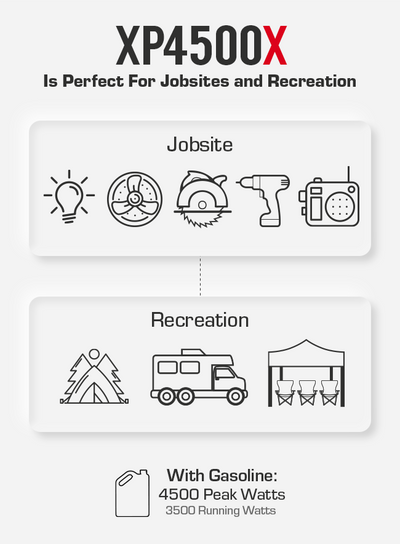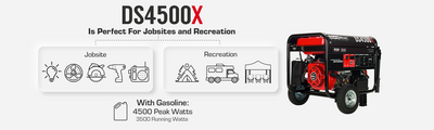 The DS4500X is perfect for power at home and on-the-go, with 4,500 peak watts and 3,500 running watts. Powered by our 212cc DuroStar engine, this generator is excellent for camping, RVs, power on the jobsite, and will run various household essentials such as lights and appliances when the power goes out.
