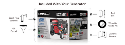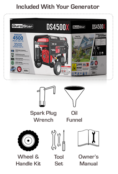 What's in the Box? DS4500X Generator, Oil Funnel, Spark Plug Wrench, Tool Set, Wheel & Handle Kit, and Owners Manual