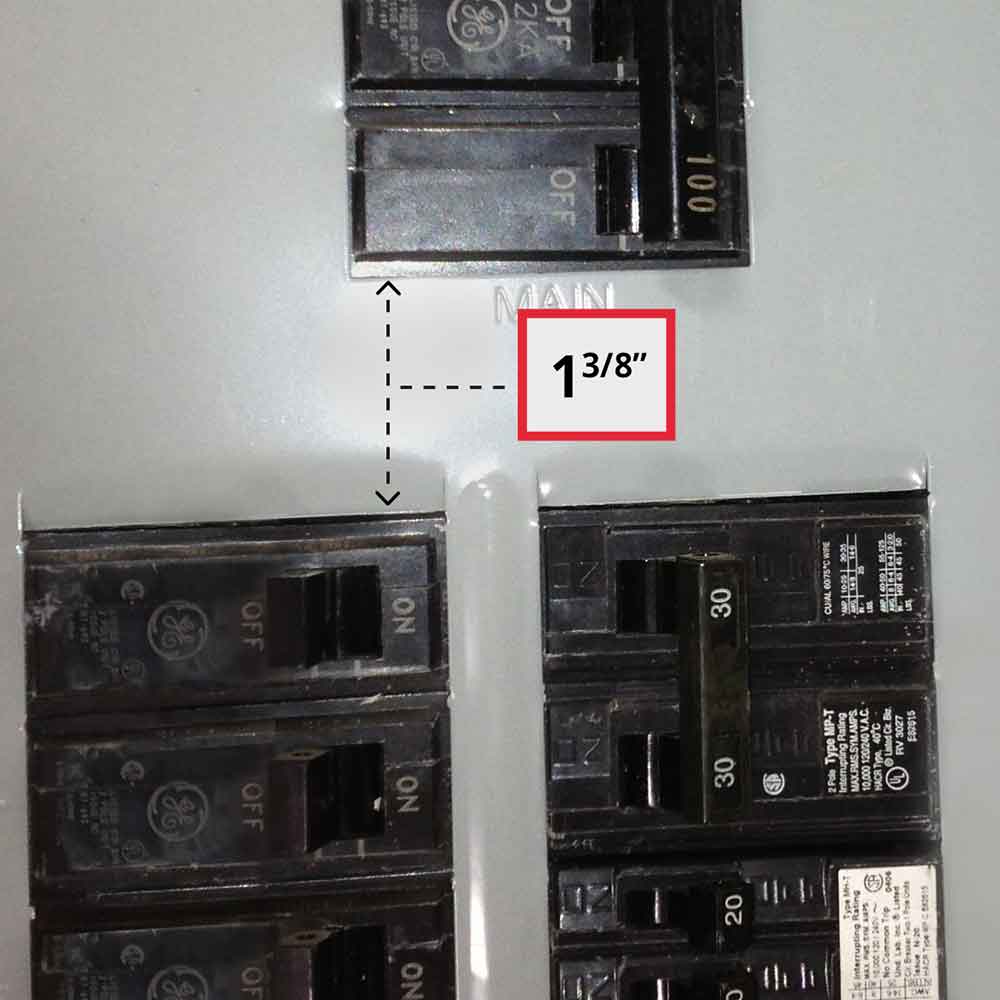 | Main Breaker | 100 amp single handle Horizontal throw right (on) left (off) 1 3/8 spacing between main and first breaker |