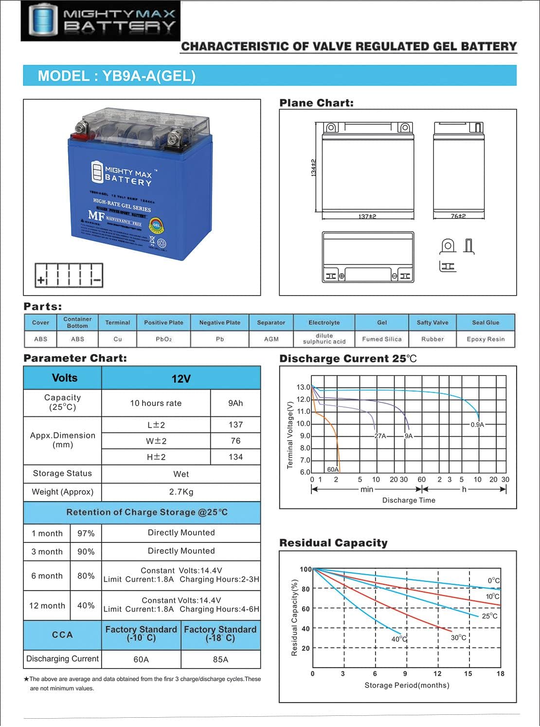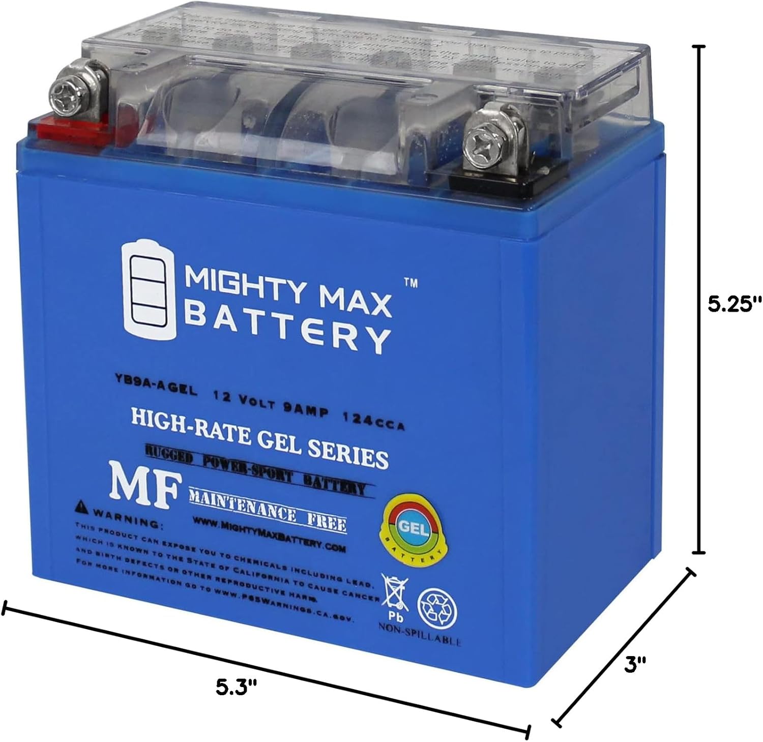 The YB9A-A GEL is a 12V 9AH GEL (Maintenance Free) battery. Requires no addition of water during the life of the battery. The Mighty Max YB9A-A GEL is a TRUE DEEP CYCLE battery that can be mounted in any position, requires no maintenance. When a Gel Cell battery is charged, no hazardous fumes escape the battery case, gases are processed within the battery itself.